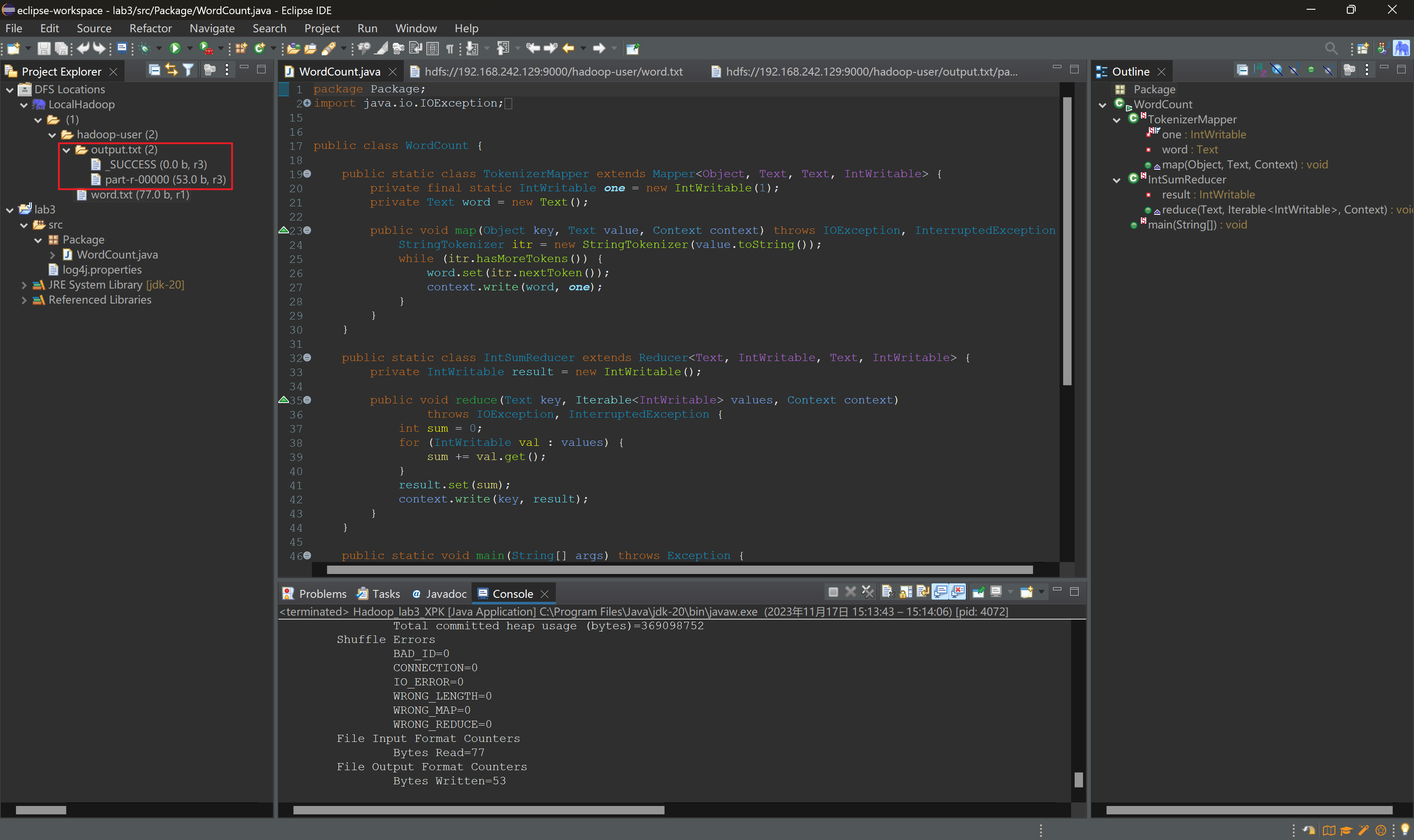 程序输出 hdfs://192.168.242.129:9000/hadoop-user/output.txt/part-r-00000 文件内容如下: