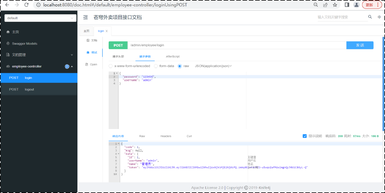 接口文档访问路径为 http://ip:port/doc.html -> http://localhost:8080/doc.html